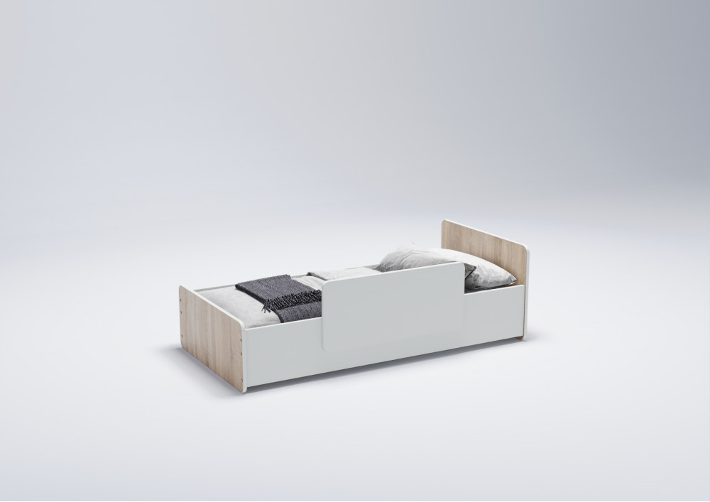 Дизайн и безопасность: Кровать невысокая с изголовьем, обеспечивая дополнительный комфорт и поддержку во время сна. Съемный увеличенный бортик безопасности может быть установлен в любом месте кровати или полностью убран по желанию родителей. Это обеспечивает дополнительную защиту и комфорт во время сна.