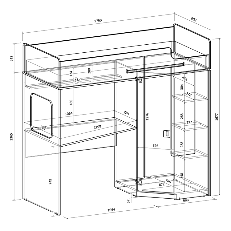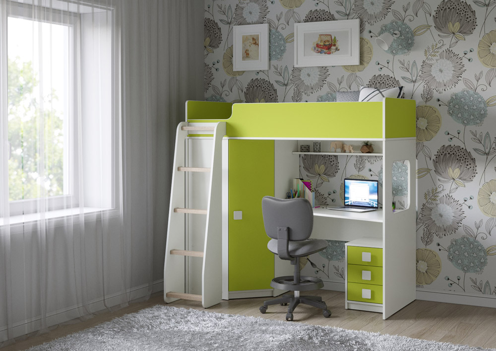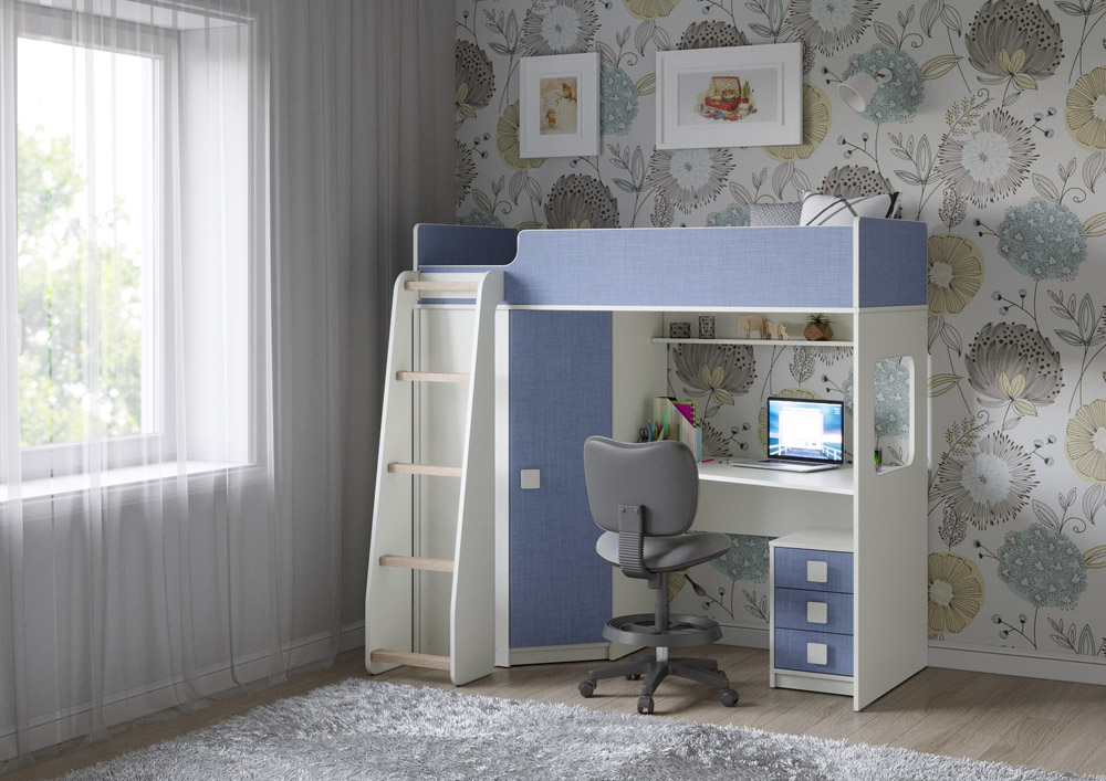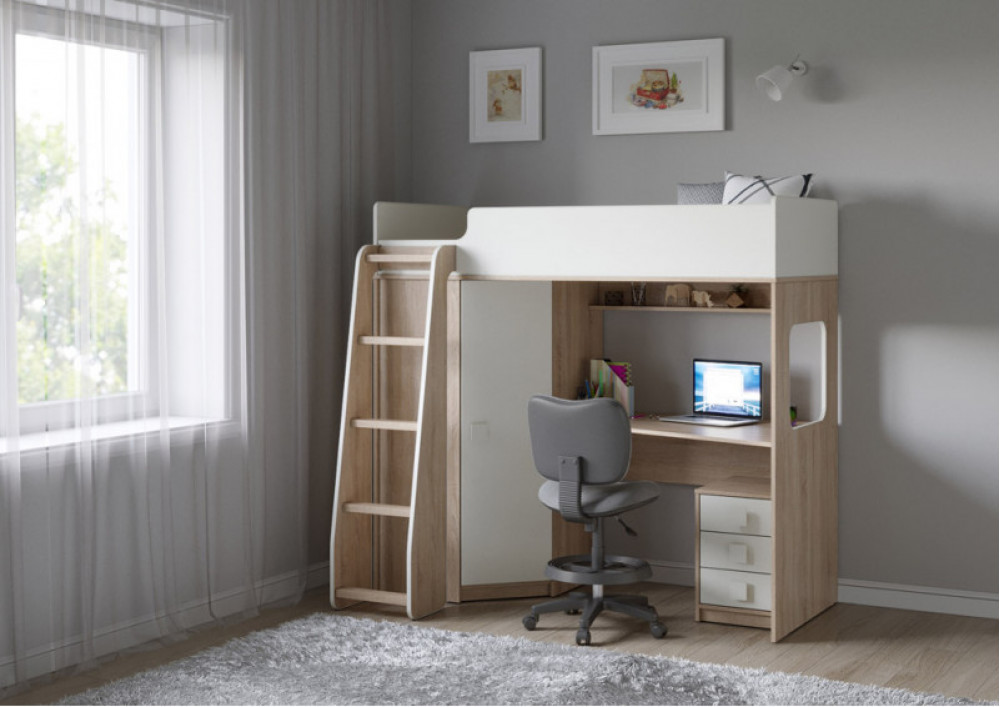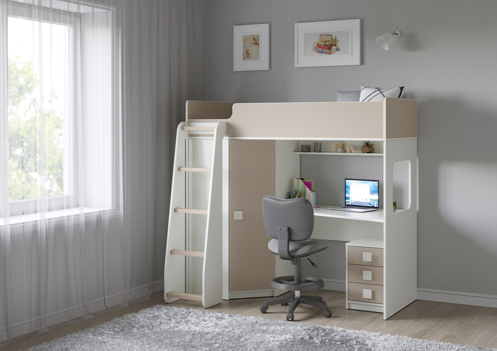 Учебная зона со столом под спальным местом открывает возможности для письменных работ,а также здесь удобно расположить ноутбук. Внизу рабочей зоны располагается тумба для хранеия канцелярских принадлежностей и учебников.