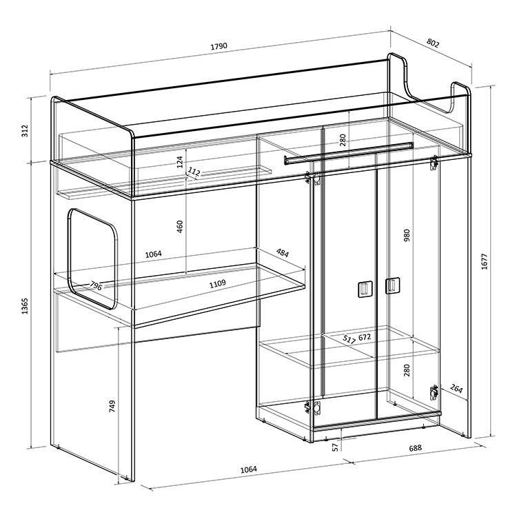 Учебная зона со столом под спальным местом открывает возможности для письменных работ,а также здесь удобно расположить ноутбук.