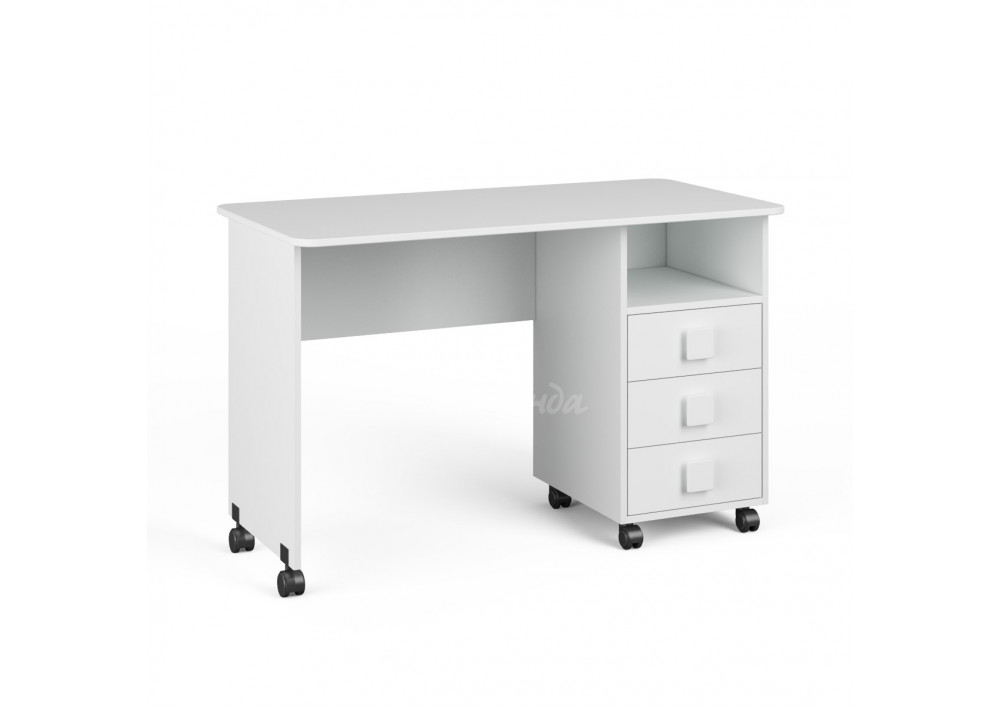 Комфортный письменный стол Л-03 белый оборудован поворотными колесами,легко перемещается по полу,задвигается и выдвигается.
